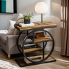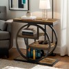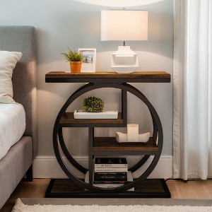 The industrial charm end table blends rustic brown and matte black metal in a slender design, featuring unique double round frames for an eye-catching focal point. With four spacious shelves, it offers ample storage for books, lamps, plants, and more, ensuring your living room or bedroom stays organized. Its adaptable slim profile allows it to serve as an end table, nightstand, or compact accent table, making it a versatile addition to any home.