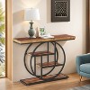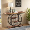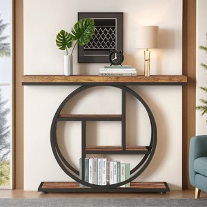 - This console table combines industrial chic with rustic charm, featuring a rugged circular base and warm finished shelves, creating a striking centerpiece in any hallway.