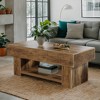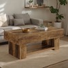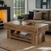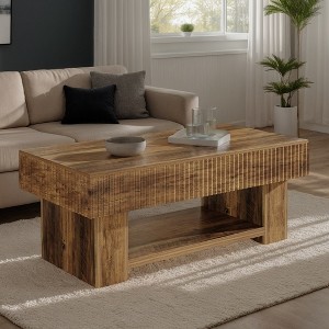This farmhouse coffee table pairs a distressed-wood top with fluted side panels for rustic charm. The spacious surface and open shelf display and store without bulk, while the scratch-resistant core handles daily use—assemble in moments and anchor your living room with timeless, organized style.