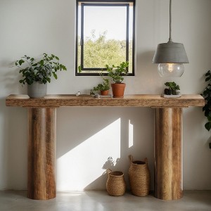 Elevate your home's style with our farmhouse chic console table, where artistic freedom meets a modern farmhouse aesthetic. Its bold designs and sleek lines bring a touch of minimalism to any space. The unique cylindrical legs not only enhance its visual appeal but also ensure sturdiness, adding to the table's rustic charm. With a roomy 63" wide rectangular tabletop, there's plenty of room for all your favorite home décor items.