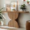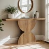 At only 13.8" deep, this 63" console mounts a warproof 2"-thick wood-grain top on a sculptural double-curved base that handles 200 lb of décor, media or mail. Slide it behind the sofa or greet guests in the entry—assembly takes 15 minutes and the rustic-modern silhouette styles itself.