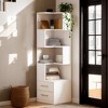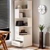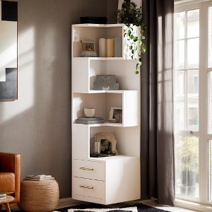 - This chic corner bookshelf features 5 open shelves and 2 spacious drawers, perfect for organizing books, trinkets, and more, ensuring a clutter-free space.