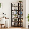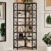 This corner shelf combines industrial chic with practical storage, featuring a metal frame and X-bars for a modern rustic look. Perfect for small spaces, With 14 open shelves, it offers generous space for books, photos, and collectibles, while the top and bottom shelves are ideal for displaying art supplies and baskets.
