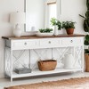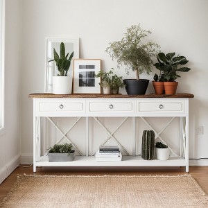 - With three spacious drawers and a bottom shelf, this entryway table offers generous storage options for organizing keys, mail, and other essentials.