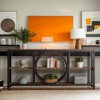 - Our console table features a distinctive circular frame with a wooden finish and metal accents, blending farmhouse charm with industrial flair to create a unique style statement in any space.