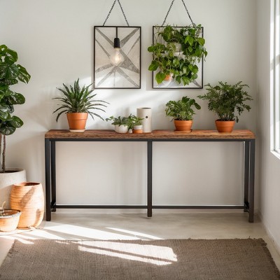 The 70.9-inch farmhouse sofa table combines convenience and style, featuring built-in electrical outlets and USB ports for easy device charging. This narrow console table is perfect for long sofas, offering a space-saving solution with a solid wood top and sturdy metal frame.