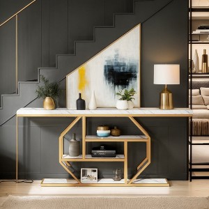 Transform your home with our chic console table, featuring a veneer top and an elegant openwork frame base. This 70.9-inch extra-long table provides ample space for displaying decor, books, or storage bins, making it perfect as a sofa table, entryway table, or hallway console.