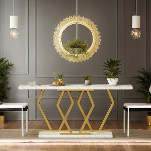- Made of a quality powder-coated metal frame and MDF base, this sofa table offers long-lasting durability. The unique geometric design structure ensures high load capacity while maintaining a lightweight profile.
