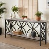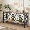 - This elongated console table fits perfectly in narrow spots like entryways or hallways. The 2-tier open shelf design offers ample room for display and storage without taking up much floor space.