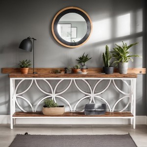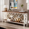 - This elongated console table fits perfectly in narrow spots like entryways or hallways. The 2-tier open shelf design offers ample room for display and storage without taking up much floor space.
