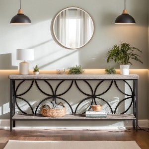 - This elongated console table fits perfectly in narrow spots like entryways or hallways. The 2-tier open shelf design offers ample room for display and storage without taking up much floor space.