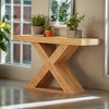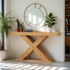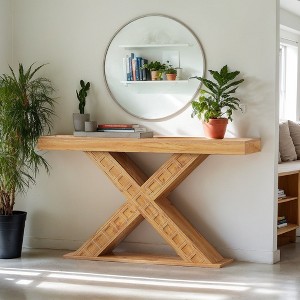 Add rustic-modern charm to your space with this slim console table. Its X-shaped wood base and light brown finish blend farmhouse warmth with contemporary elegance, perfect for sofas, entryways, or tight hallways. Versatile in style, it effortlessly complements any decor while displaying lamps, books, or decor with understated grace.