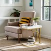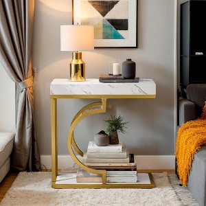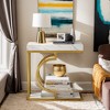 - The semicircular gold frame of the faux marble end table brings a touch of elegance to your room, blending modern aesthetics with everyday functionality. Its sleek design is not only visually appealing but also practical, making it an essential addition to any living space.