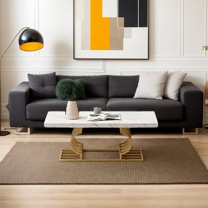 This rectangular coffee table offers a spacious tabletop surface (47.24” W x 19.68” D), that is the perfect place for you to set your cup of coffee, the morning newspaper, display home decor, or kick your feet up while you sit back and relax. The 1.96-inch thickened top is made with warp-resistant MDF and durable laminate, easy to clean with a dry cloth. Faux marble coffee table with a striking geometric design for a touch of impeccable style, This modern coffee table gives your home the functionality that you need with the style that you have always wanted. With an airy silhouette, the dazzling gold frame is a work of art with its double C-shape cutouts and minimalist vibe. The metal frame is solid and rust-proof and supports 220 lbs without shaking. This coffee table is designed with rubber stoppers at the bottom that prevents sliding around as well as scratching the floor. A multi-purpose coffee table, cocktail table, and center tea table perfect for the living room, family room, condo, or dorm. You can set this modern cocktail table in your living room to proudly display your favorite collectibles or in your home study to add a glamorous touch. This accent table is a place to eat, a place to entertain, and a place to spend happy times with your family and friends.