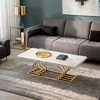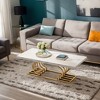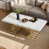 - Add a touch of impeccable style to your living room with this modern coffee table. The striking geometric design and faux marble tabletop make it a statement piece that will upgrade any space.