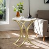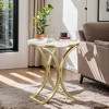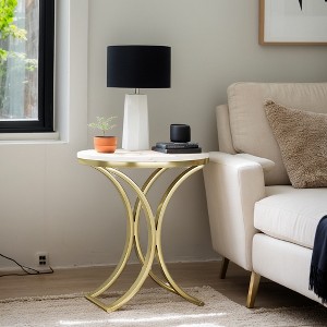 Simple yet tasteful. Clean lines, faux marble textures, and geometric stylish gold metal C legs make up a contemporary luxurious theme. A beautifully simple side table compact enough to fit small or tight spaces and provides a unique modern touch.Small light and convenient to move around as needed. Used as a modern side table or a small coffee table in the living room, a gold nightstand for the bedroom, an elegant addition for placing magazines, snacks, coffee, or a decorative centerpiece. Enjoy its versatility and set up anywhere in your home.Overall Size: 19.7” D x 23.62” H. Constructed of gold powder-coated metal and thick particle board which is waterproof, scratch-resistant, and easy to clean, and offers enough support for all your essentials. Sturdy construction ensures long-time use.Gold and White Accent table are great pieces of furniture that can enhance the look of any room. This small end table is a nice addition to any room. Place it in your living room, bedroom, or reception area. Lightweight easy to move.