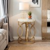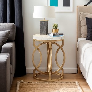 This modern round end table adds a touch of elegance to any living room with its faux marble top and matte gold ring-shaped frame. It's unique appearance and minimalist design make it a standout piece.The chunky metal frame and adjustable foot pads ensure stability and durability, while the smooth faux marble particle board is easy to clean and maintain. This gold round-end table is built to last.With clear instructions and labeled parts, anyone can assemble this round side table in no time. Overall dimensions: 19.7"W x 19.7"D x 25.6"H. Accent table weight: 17.6 lbs.With a 19.7-inch diameter tabletop, this end table provides ample space for all your living room essentials, from coffee cups, and lamps to tissue boxes. Keep everything within reach and organized.