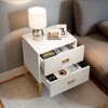 Experience exceptional storage and design with this large, two-drawer white and gold bedside table. Boasting a modern and chic aesthetic, it effortlessly blends form and function to offer a practical solution for organizing your essential items in style.More than just a bedside companion, this multifunctional piece can be utilized as an end table, accent table, or a storage unit in various areas of your home – from the living room to the dormitory, and even the hallway. Its wide dimensions and distinctive appearance make it a captivating focal point that enhances the functionality and aesthetics of any room it graces.In essence, this two-drawer, white and gold nightstand merges ample storage with modern elegance, transforming your organization needs into a tasteful statement piece for every corner of your home.