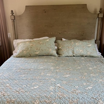 I’ve been looking for a quilt for our queen size bed for quite a while. I am very pleased with this quilt purchase, in ‘teal.” As noted in prior review, I would agree a spa blue/green. I love the print-perfect for us. Not to over powering, and not to girly for my husbands taste. I decided to order a king size, mainly due to shortness of width length of OTHER QUEEN SIZE quilts that I’ve order-cheep. At first, I thought that the king was to large, however, once I made the bed it has turned out just the way I like it. I believe it would suit a king size mattress as well, the sides would just fall slightly shorter; that would be of personal preference. It also pairs nicely with the neutral colored Fieldcrest queen blanket as shown in picture. The quality of the fabric is very nice, not stiff, however not flimsy; I would say, well made. Shams are very nice too! I haven’t washed it yet, but I feel with the quality of the fabric it will hold up well. Very happy!!