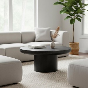 This round coffee table features a clean, modern silhouette with a smooth wood-look tabletop and a stable pedestal base. The black finish adds a refined feel, making it easy to coordinate with both light and dark furniture. Designed to suit living rooms, lounge areas, and open spaces, it provides a sturdy surface for beverages, books, or décor. The MDF and plywood construction maintains durability while keeping the piece lightweight for everyday use.