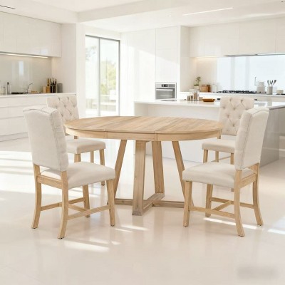 Designed for everyday meals and casual gatherings, this 5-piece dining set brings warm, classic style to kitchens and dining rooms. The square table features a durable MDF top with a natural wood finish, while the four ladder-back chairs offer comfortable seating and sturdy rubber wood frames. Compact and versatile, it fits easily in apartments, breakfast nooks, or small dining spaces, creating a welcoming spot for meals and conversation.