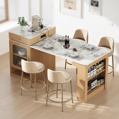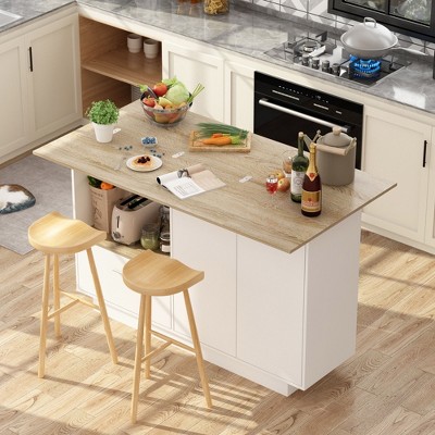 Homy Casa 55.5" Fluted Kitchen Island with Drop Leaves, Power Outlet & Storage Cabinets
