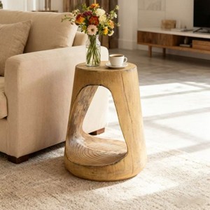Bring organic warmth and character to your space with this Homy Casa solid wood end table. Handcrafted from natural wood with a rustic oak finish, it features a smooth round top and an open lower shelf, perfect for displaying décor or keeping essentials close at hand. The sculptural silhouette adds a modern artisanal touch to living rooms, bedrooms, or reading corners, blending seamlessly with farmhouse, boho, or Scandinavian interiors.