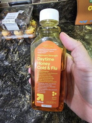 Help relieve cold and flu symptoms with Daytime Honey Cold & Flu from up&up™. This liquid medicine contains a pain reliever/fever reducer, nasal decongestant, cough suppressant and an expectorant. This maximum-strength treatment comes in an alcohol-free, non-drowsy formula and the honey flavor gives it a sweet taste.