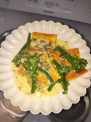 [This review was collected as part of a promotion.] I loved trying this honey pumpkin goat cheese ravioli. The colors and flavors are very fall and just make the meal extra cozy. My toddler tried the ravioli as well and wasnt as huge of a fan but it is always worth a shot to get him used to different tastes and textures. I thought the flavor was subtle with just a hint of sweetness. I paired with chicken with hot honey on top and it was a great pair!