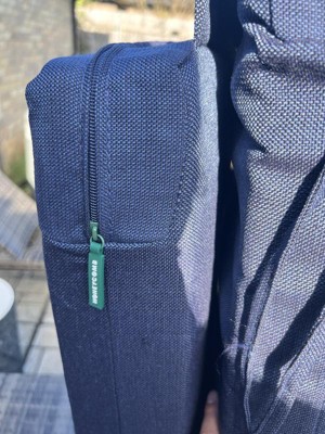 We have the Honeycomb Outdoor Chair Cover in Textured Solid Indigo Blue. They are very comfortable and feel sturdy to last us a while. Unfortunately with the Fall New England weather, we have to take ours inside now. Easy to fold up and store. Ties in each corner to make sure they stay. They look really sharp and we have received multiple compliments on the comfort and how great they look.
