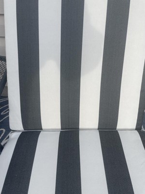 I love my Cabana Stripe Black & Ivory Cushion. It fits my chaise lounge well and has ties on each side to hold it into place. My particular chaise lounge doesn’t accommodate the upper ties, but the other set of ties hold it in place well. It is stylish and looks great on my deck. It’s comfortable to sit on and has made my chaise lounge my favorite place to sit when I’m outside.