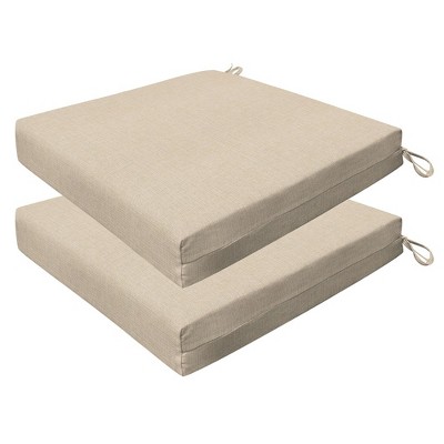 Revive your outdoor furniture in quality and style with our 2-pack universal patio seat cushions. Crafted with durable and beautiful fabrics, these cushions will resist the elements while remaining bright and beautiful for years to come. Finished & filled in the US with superior recycled polyester fiber for long-lasting comfort and support. Measures 18"W x 17 1/2"D x 2 1/2" thick.