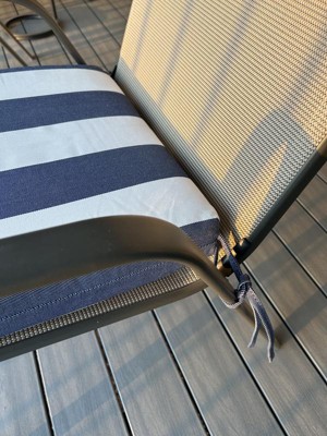 These blue and white stripe chair pads look great on my chairs. They are well padded and comfortable. I definitely recommend them. They have a nice clean look. I would take them in when it rains to kefp the white clean.