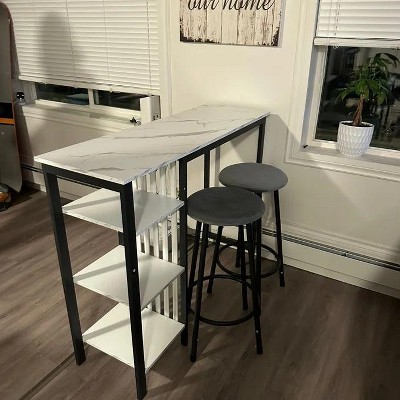 I love this, it is just what I was looking for. I live in a small one bedroom in NYC and this was perfect for space saving. The chairs push completely under the table, the table is reversible and is fairly lightweight for times where you want to move it. I sometimes will turn it perpendicular to the wall when having a more intimate meal so that I can face my guest. Love the storage shelves on the side because we can all use more storage or areas to display our trinkets. Finally, I always get compliments on how well it works for my space and the design. Very sturdy, and looks classy!
