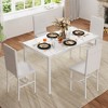 This 5-piece counter-height dining set turns any corner in your kitchen into a contemporary breakfast nook. The table has a faux black marble tabletop with Four steel post legs support this table for a minimalist silhouette. The four bar stools have full backs and are upholstered in faux leather with a foam filling for just the right amount of support as you sit. The chairs have four straight legs to complete the clean-lined silhouette.