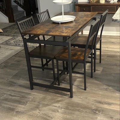 - Rustic Dining Table Set: This 5-piece dining table set includes a table with a rustic brown composite wood grain tabletop, and four chairs with exquisite curved black metal frames. With the clean lines and delicate wood grain finish, the industrial table set can perfectly blend into any room decoration.