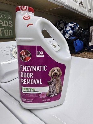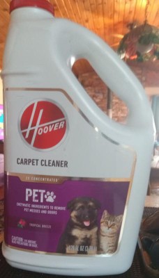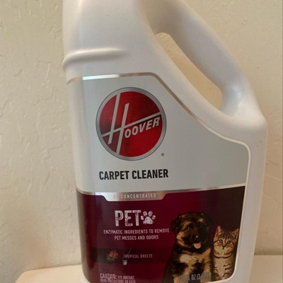 Hoover Pet Carpet Cleaning Solution makes it fast and easy to clean up after your furry friends! Specifically designed for use in full-size carpet cleaners, this unique solution uses enzymatic ingredients to neutralize odors and remove tough pet messes. It also continues to work even after you've finished cleaning! Plus, the tropical breeze scent will leave your home smelling fresh.