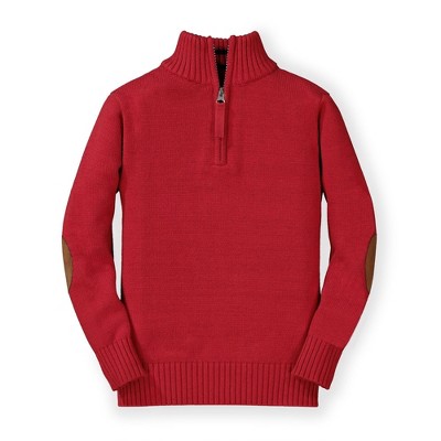 This stylish mock neck button pullover in soft organic cotton will be a staple in your boy's cool weather wardrobe. Features an interesting textured herringbone knit on the body and sleeves, jersey stitch on the yoke and front flap pocket, and faux suede elbow patches. A stylish essential to go from day to night!