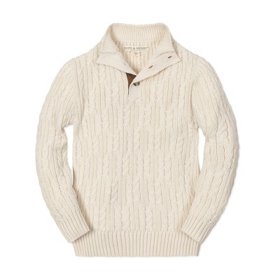 Our plush mock neck sweater in soft organic cotton lends an instantly polished look to your boy for all the activity that cool weather brings. Features a beautiful chunky cardigan stitch, rib trim, and a button placket with faux suede detail. Pairs perfectly with our collection of organic cotton button downs.