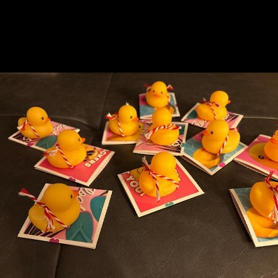 The ducks and cards are adorable. However, the string they give you to tie the ducks on is so short, and they do not stay on well. Tried double-sided tape, but it will not stick to the card or the duck. Having a very hard time attaching ducks to the cards… They should have included longer string. Also string that doesn’t fray apart would be more helpful.