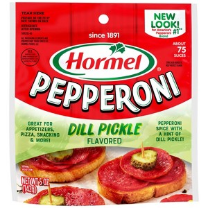 Top your pizza with the pepperoni spice you love and now a hint of dill pickle with HORMEL Pepperoni Dill Pickle Flavored slices from the maker of America’s #1 selling brand of pepperoni. (Based on the latest 52 week Circana data.) HORMEL Pepperoni is made using only the best, highest-quality meat and spices, and an old-world dry-sausage making tradition passed down generation-to-generation. Now we've made it better for dill pickle lovers! Grab a pack of pre-sliced, ready-to-eat HORMEL Pepperoni Dill Pickle Flavored to create memorable family meals or party appetizers adults and kids love. Open a pouch to perk up any deli meat sandwich, pita pocket, pizza bagel, and more. Pair with cheese and cracker as snacks, or enjoy some slices as part of a carb-conscious or gluten-free diet. Whether you add HORMEL Pepperoni Dill Pickle Flavored slices to deep dish or your charcuterie board, it's an delicious taste everyone can enjoy. Includes one 5 oz package of HORMEL Pepperoni Dill Pickle Flavored. All trademarks, logos and images are owned by Hormel Foods Corporation, its subsidiaries and affiliates. Copyright Hormel Foods, LLC