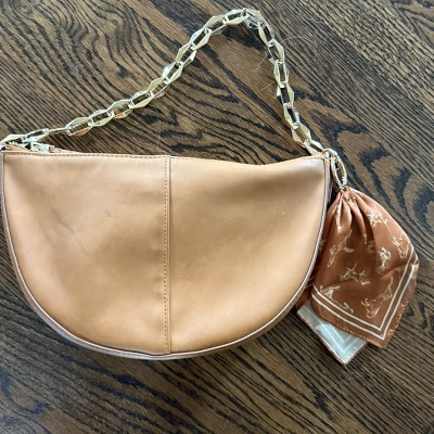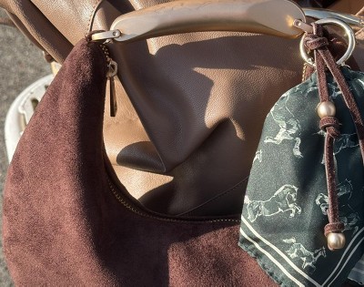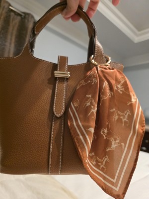 A: The scarf bag charm features a stylish horse print in a brown hue.
