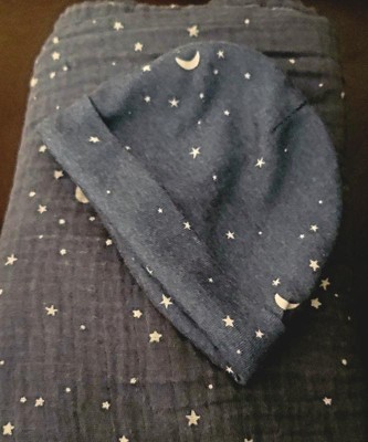 This muslin swaddle is so adorable! I got it mainly because of the dark blue color, making it perfect for the random spit ups that baby tend to have. The swaddle is very soft and breathable, the hat is a tad bit warmer but still very breathable nonetheless. I love it!