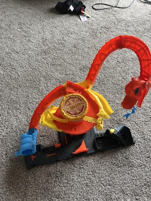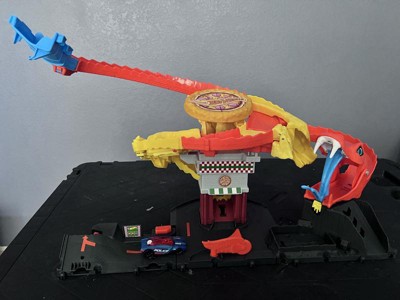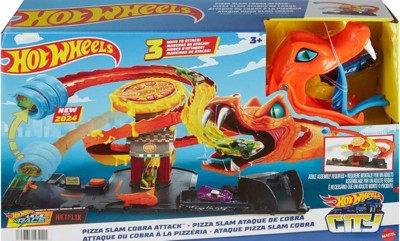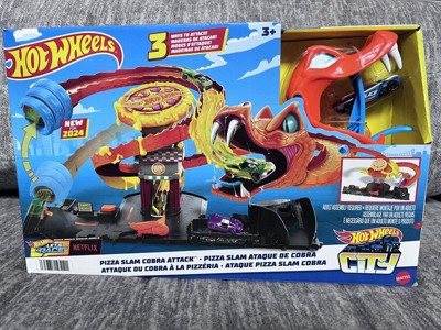 Take on a hungry cobra that has slithered into the pizza shop and save Hot Wheels City just like in the Netflix series 'Let's Race'! Drive into the cobra's tail and release it to see which of three random paths the car will take. Will it race through the cobra's mouth and end up in the dumpster? Maybe it will have the unfortunate ride that ends in the creature's mouth. Or maybe it will send a pizza pie smack into the cobra's face, defeating it! The set features cool track play details to inspire storytelling adventures and can connect to other Hot Wheels City sets for open-ended play. Each sold separately. One Hot Wheels car is included. Colors and decorations may vary.