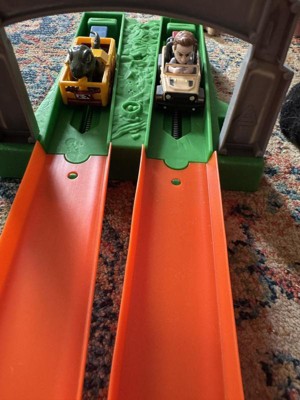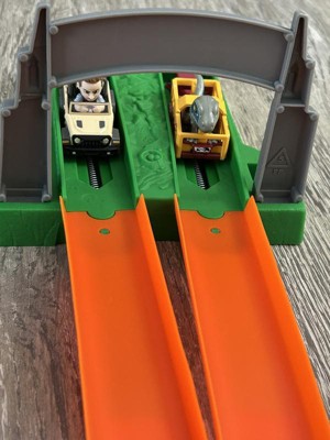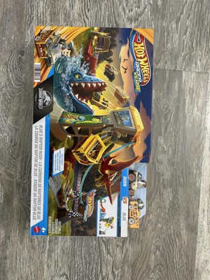 Race to escape Jurassic World island in this Hot Wheels RacerVerse track set that features a drag race and a zipline at the finish. It includes die-cast racers Blue the Raptor and Owen with non-removable figures in the drivers' seats of die-cast Hot Wheels vehicles that are primed for track racing. The fastest racer will make it to the watchtower and zipline to safety while their opponent will fall into the open mouth of the awaiting Mosasaurus. The set folds in half for easy storage. Color and decorations may vary.