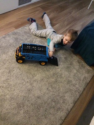 I received this for my children to try out and from first look this one was a winner, was easy to get out of the box and the 3 trucks that were included were a great start to my boys new hot wheels collection. It has 2 levels which fits lots of cars and the trucks, my boy put his normal hot wheels cars in and they fit also. He loved the truck the blue, yellow and black colour and design are great and the flick bit at the bottom that shoots the cars and trucks out of the ramp provided hours of fun! The ramp at the back clicks in and out so if you just want to store you cars or trucks in there there’s plenty of room. All in all a great toy which will provide hours of fun for my little boy and girl!
