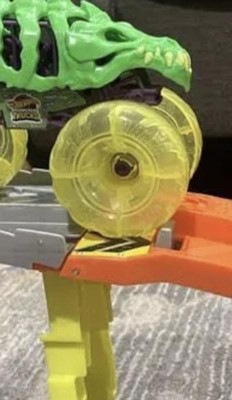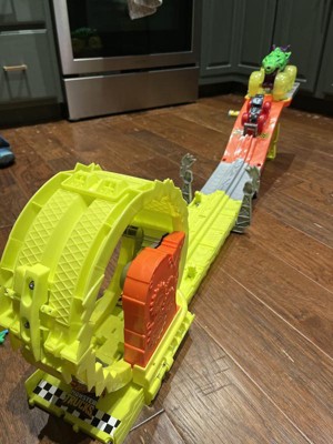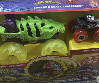 An oversized Skelesaurus and 1:64 scale Bone Shaker face off in a race to avoid destruction! Release the two vehicles with the power switch and see if Bone Shaker can beat out the evil foe as they speed down a hill toward a massive loop. A randomizer selects one of two outcomes: Bone Shaker makes it through the loop and escapes to safety while Skelesaurus gets left in the dust, or Skelesaurus catches its prey, trapping Bone Shaker in the loop, knocking it over. Set includes two crushed cars for extra destruction. Colors and decorations may vary.