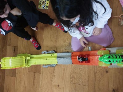 [This review was collected as part of a promotion.] This is a great track The kids love to play with us easy to set up, easy to play with and easy to keep together that’s important, but yeah, the kids loved playing with the cars. The track was bright and colorful.