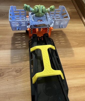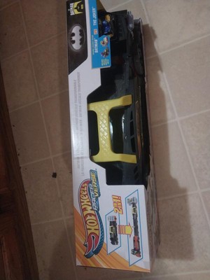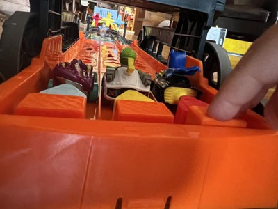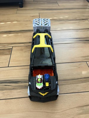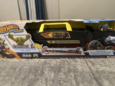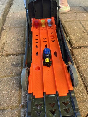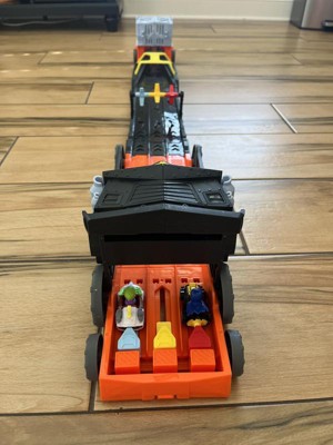 Take the Hot Wheels RacerVerse action On-the-Go with this massive Batman-themed hauler that transforms into a three-lane racetrack! The large-scale vehicle features Batman graphics and can store up to 20 Hot Wheels RacerVerse vehicles. It opens to reveal a three-lane raceway with three spring-powered launchers and three spinning obstacles. Racers compete to recapture Killer Croc without getting held back or blocked. Two die-cast Hot Wheels RacerVerse vehicles are included: The Joker and an exclusive Batman are included. Additional vehicles sold separately. Colors and decorations may vary.