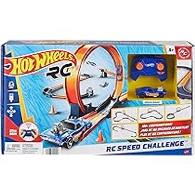 The Hot Wheels RC Speed Challenge track set features 30+ track pieces and a Hot Wheels remote-control car for the ultimate in racing and stunting. Design an epic race course with twists and turns or build one for high-speed stunting with an awesome loop. Test it out with the included 1:64 scale remote-control vehicle that can race and stunt on and off Hot Wheels tracks. The set inspires open-ended play, creativity, unlimited racing and wild stunting. Colors and decorations may vary.